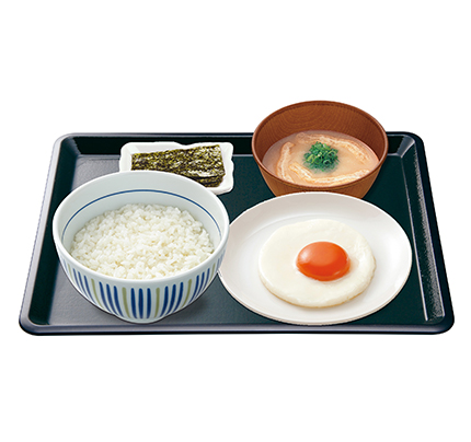 ご飯、味噌汁、目玉焼き、海苔、納豆、豆腐だった