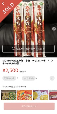 【悲報】森永製菓さん、「小枝」発売50周年を記念して「50倍小枝」を発売するも、早速テンバイヤーの餌食になってしまう