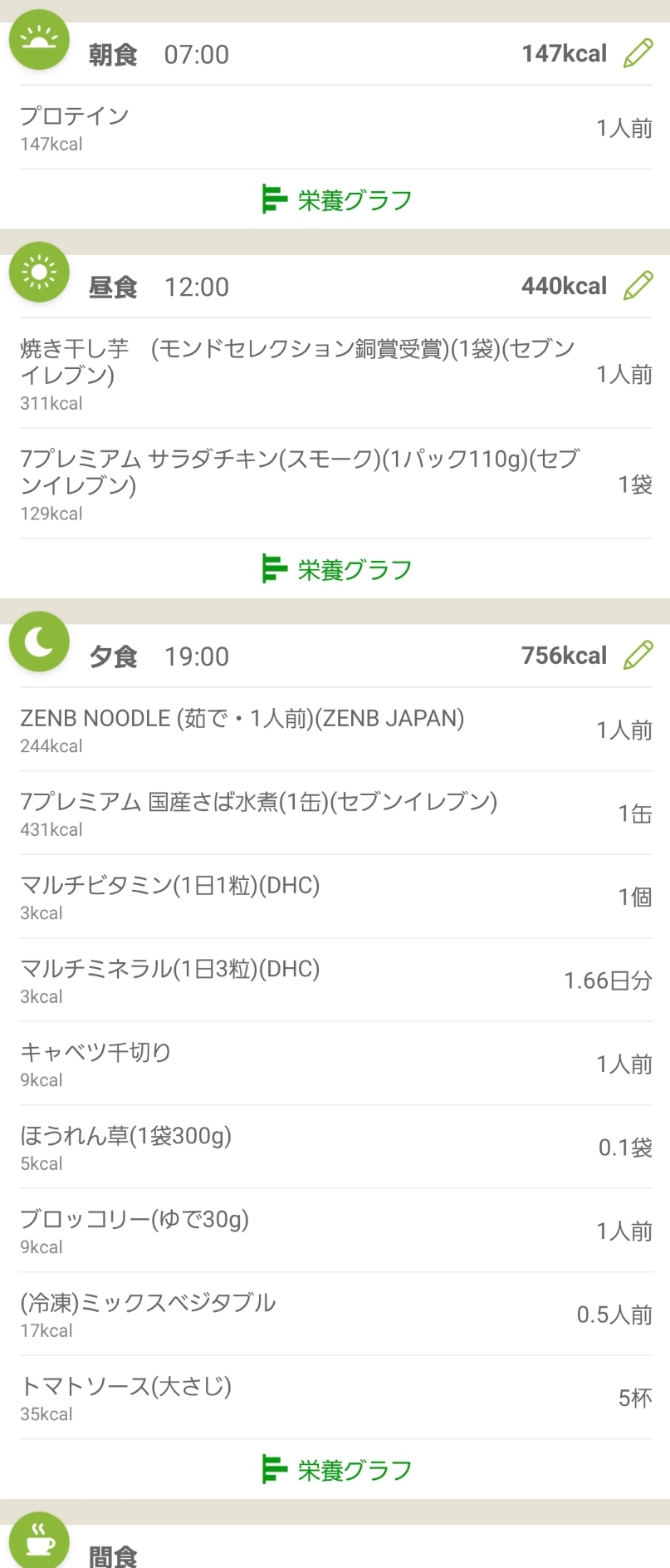朝カップヌードル、昼サラダドレッシング無し、ほうれん草と油揚げの炒め物、夜食べない
