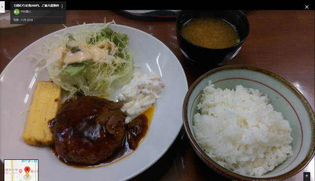 『日替わり定食350円、ご飯大盛り無料』 のハンバーグ定食。