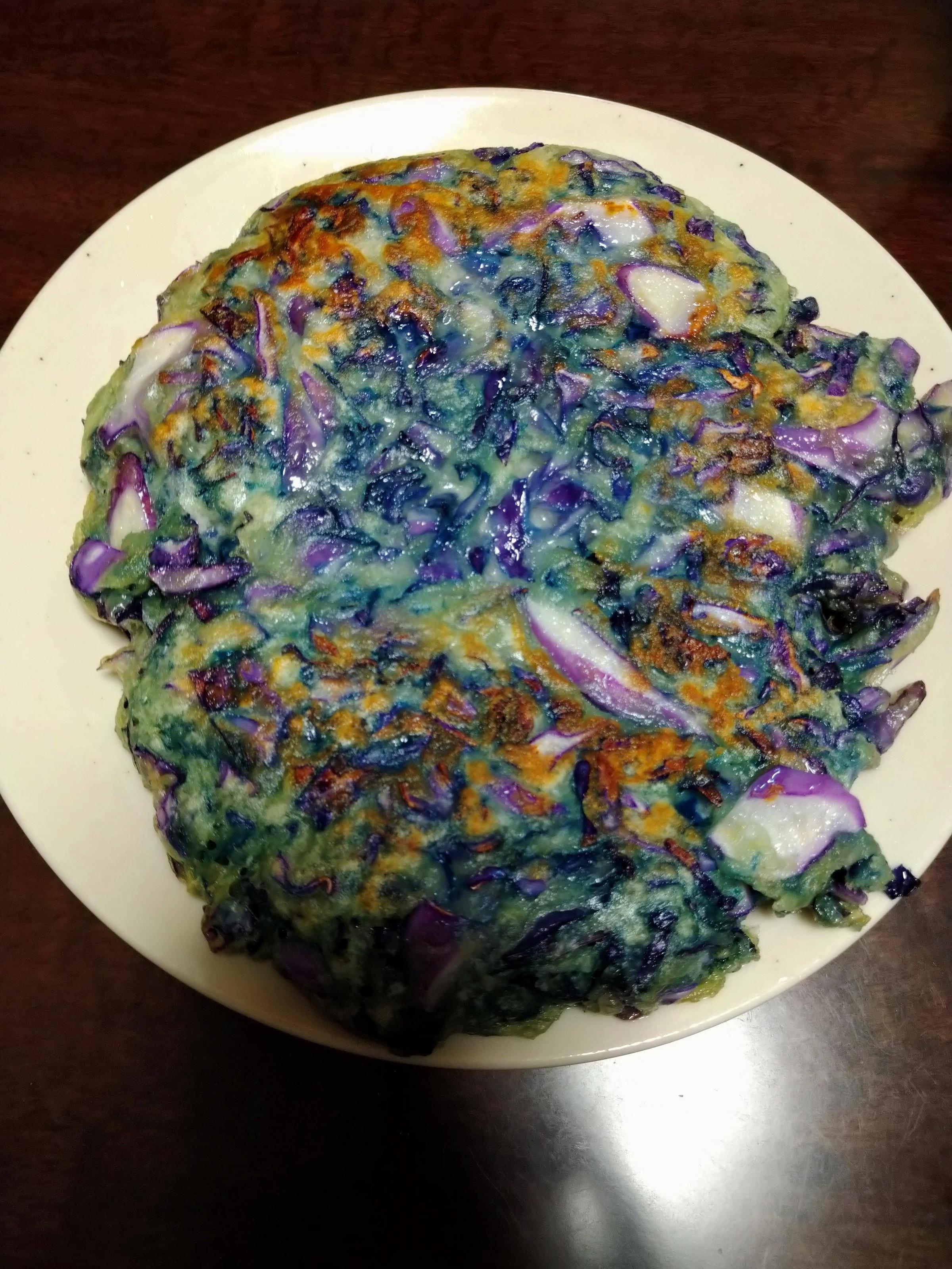 紫キャベツの汁が重曹か何かに反応して青くなったんやな多分