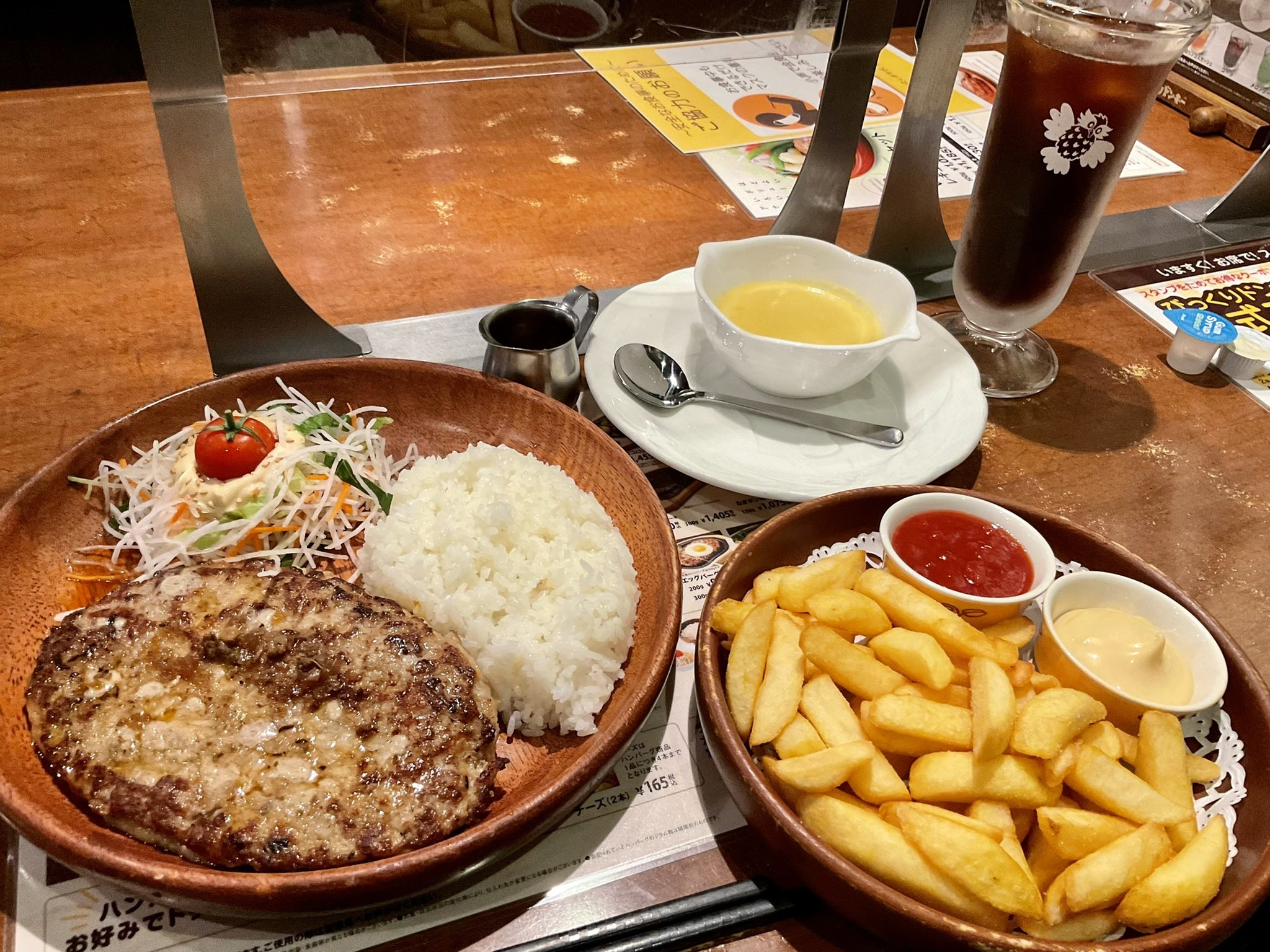 外食でハンバークは、近所の松屋というハンバーグ食堂利用する頻度が一番多いわ。牛めしやカレーもある
