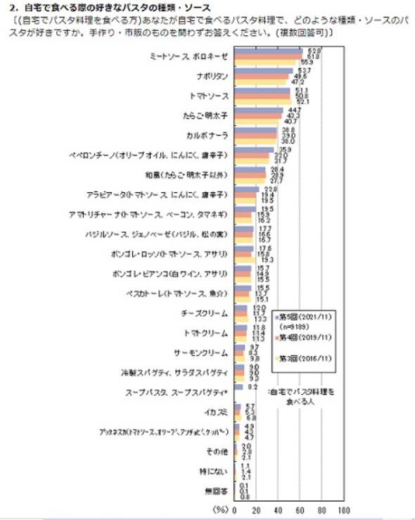 ミートソース>たらこ>ナポリタン>ツナマヨ>和風きのこ>カルボナーラ>焦がしねぎ塩>ペペロンチーニ>アラビアータ>カニのトマトクリーム>バジル