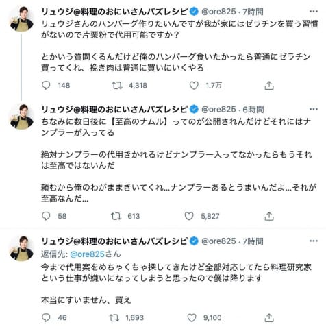 この人に限らず料理研究家のTwitterはリプ欄が「〇〇がないときはどうしたらいいですか?」って質問で埋め尽くされてるからな