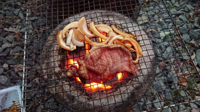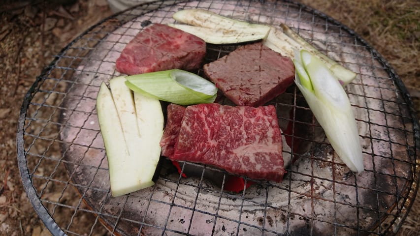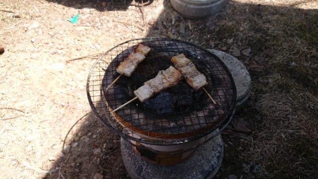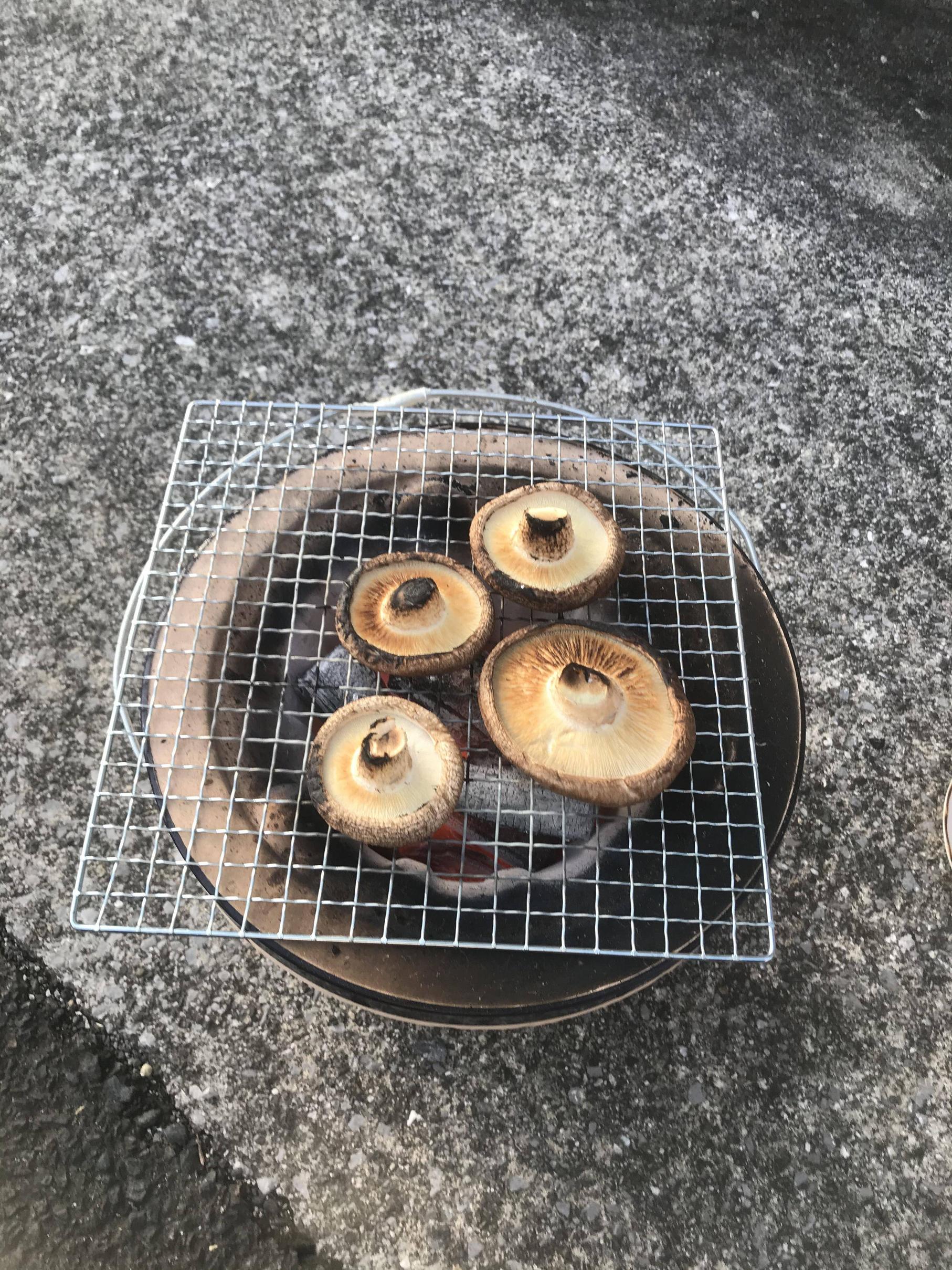 しいたけなら炭火の上に金網で焼いても匂いも煙もそれほど出ないから、肉・魚は横でしいたけとか野菜は上で焼けばいいのかな?