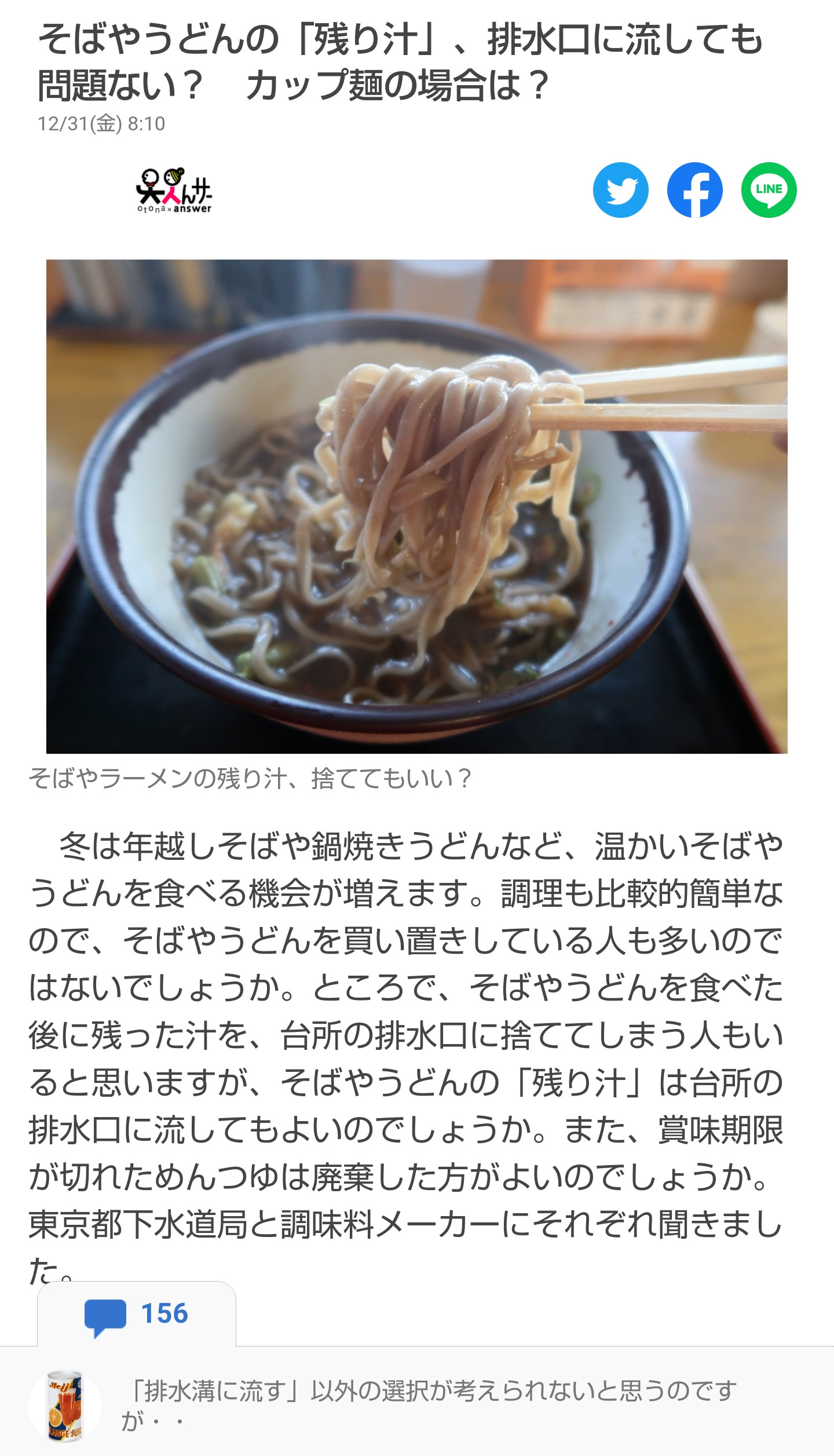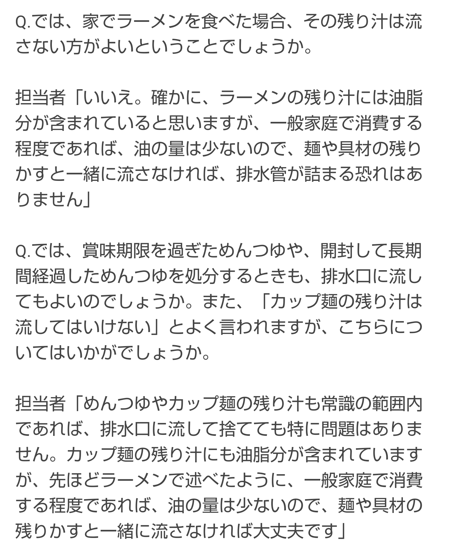 ただ具や麺の残りである固形物は少量でも流さない方がいい、って書いてあったね