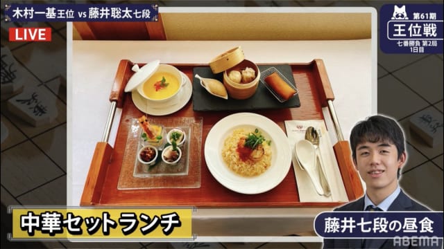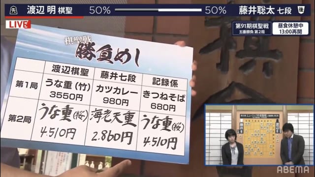 9日の昼食 渡辺明 しあわせたまごのオムライス 藤井聡太 天ぷらうどん 10日の昼食 渡辺明 うな重 藤井聡太 しあわせたまごのオムライス