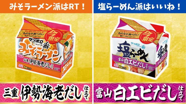 サッポロ一番、塩大好き、醤油好き、味噌食わないけど旨辛味噌味は好き