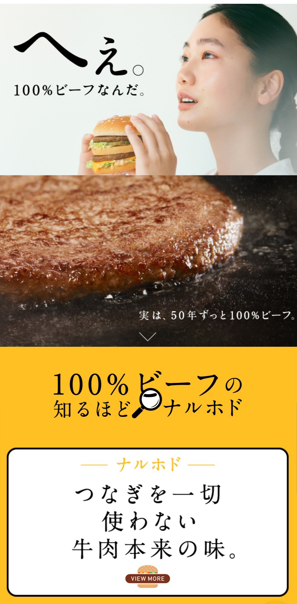 実は、50年ずっと100%ビーフ。 https://www.mcdonalds.co.jp/sustainability/food/naruhodo/