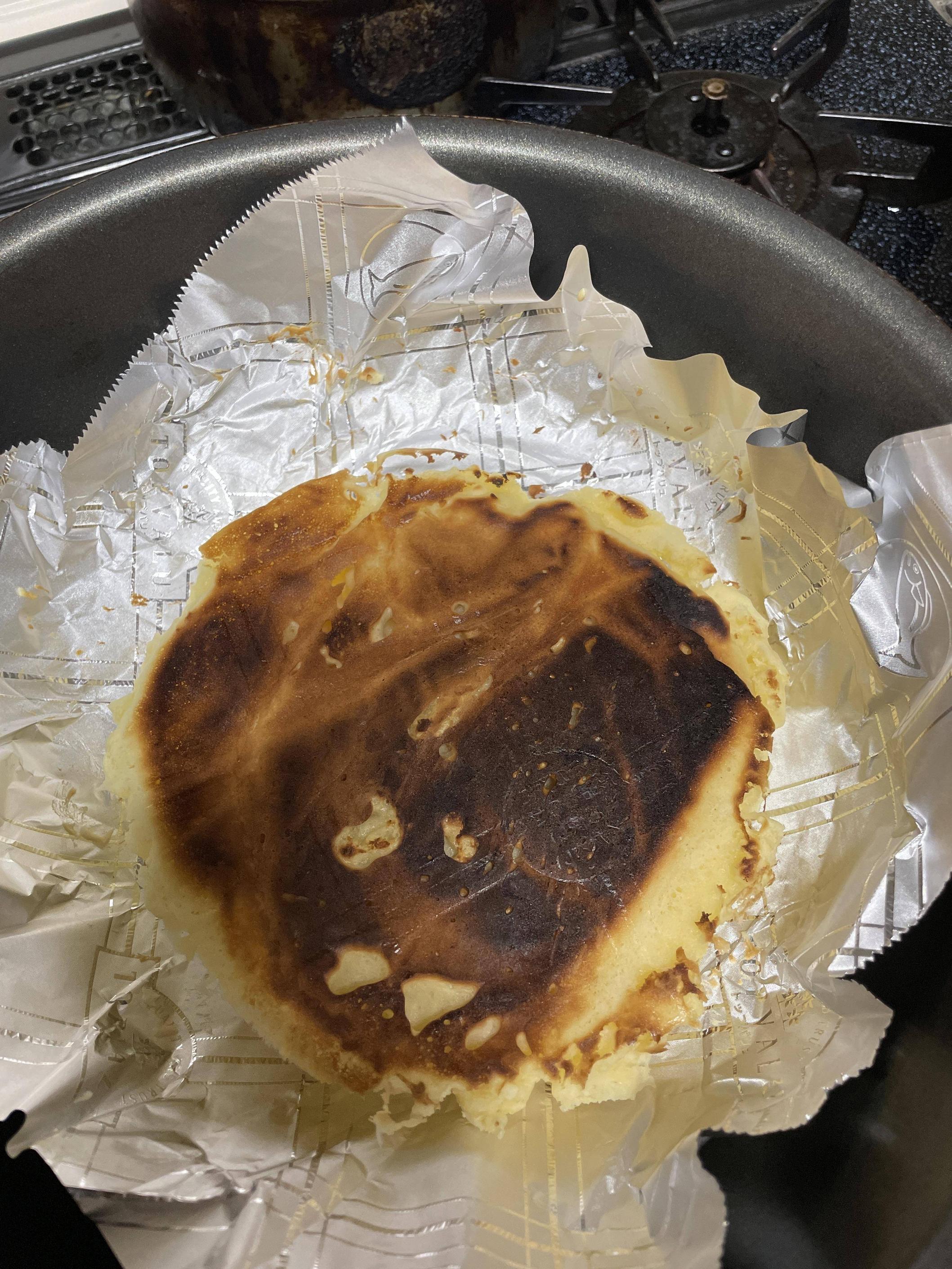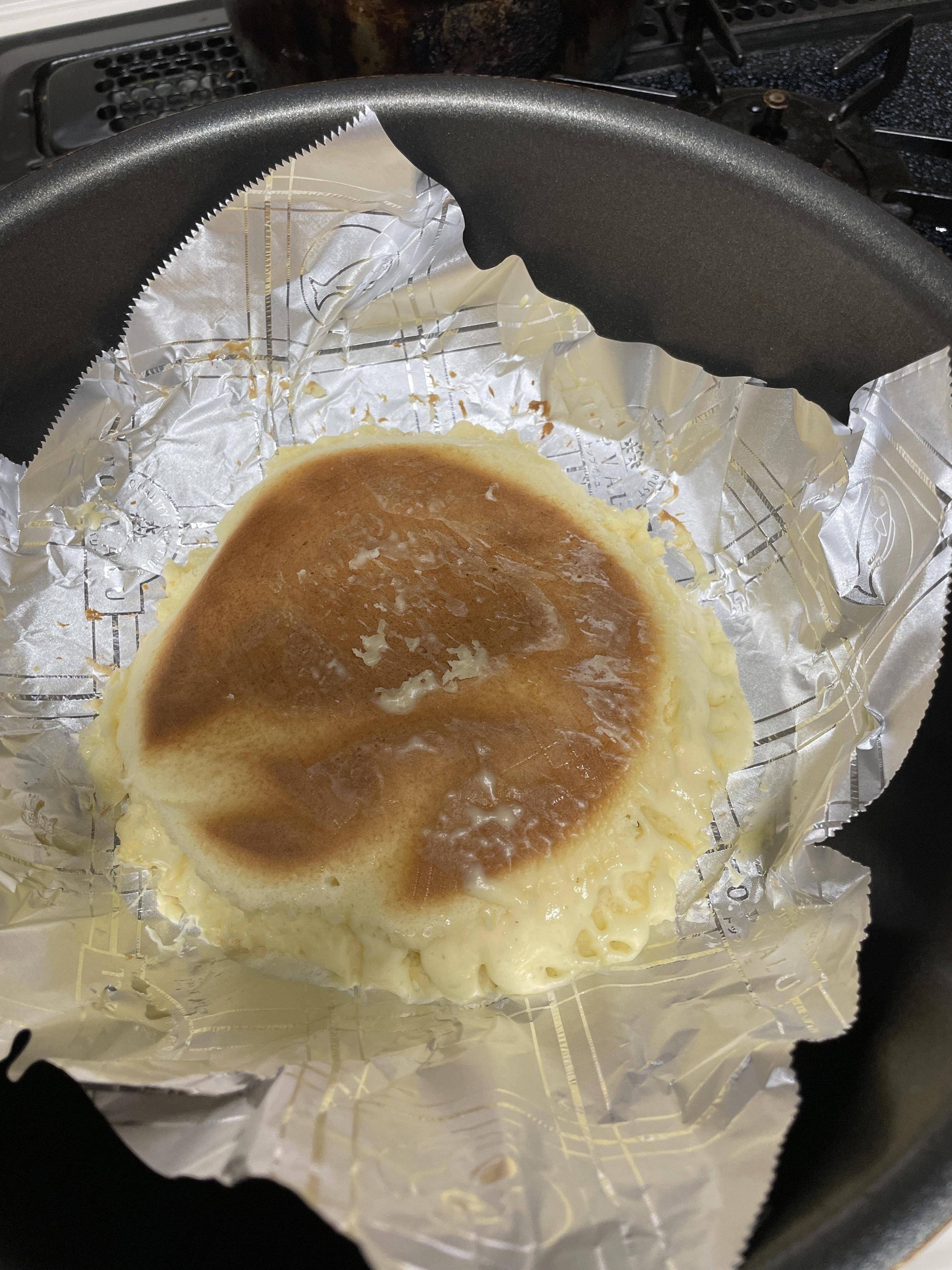 ひっくり返して普通のフライパンで焼いてない片面また弱火で焼いたら失敗はせんぞ