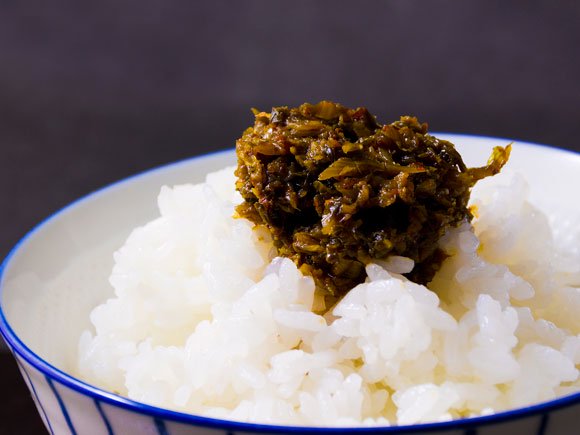 高菜漬けを水切って刻んでごま油少量で軽く炒めてさ、あつあつご飯に乗っけて