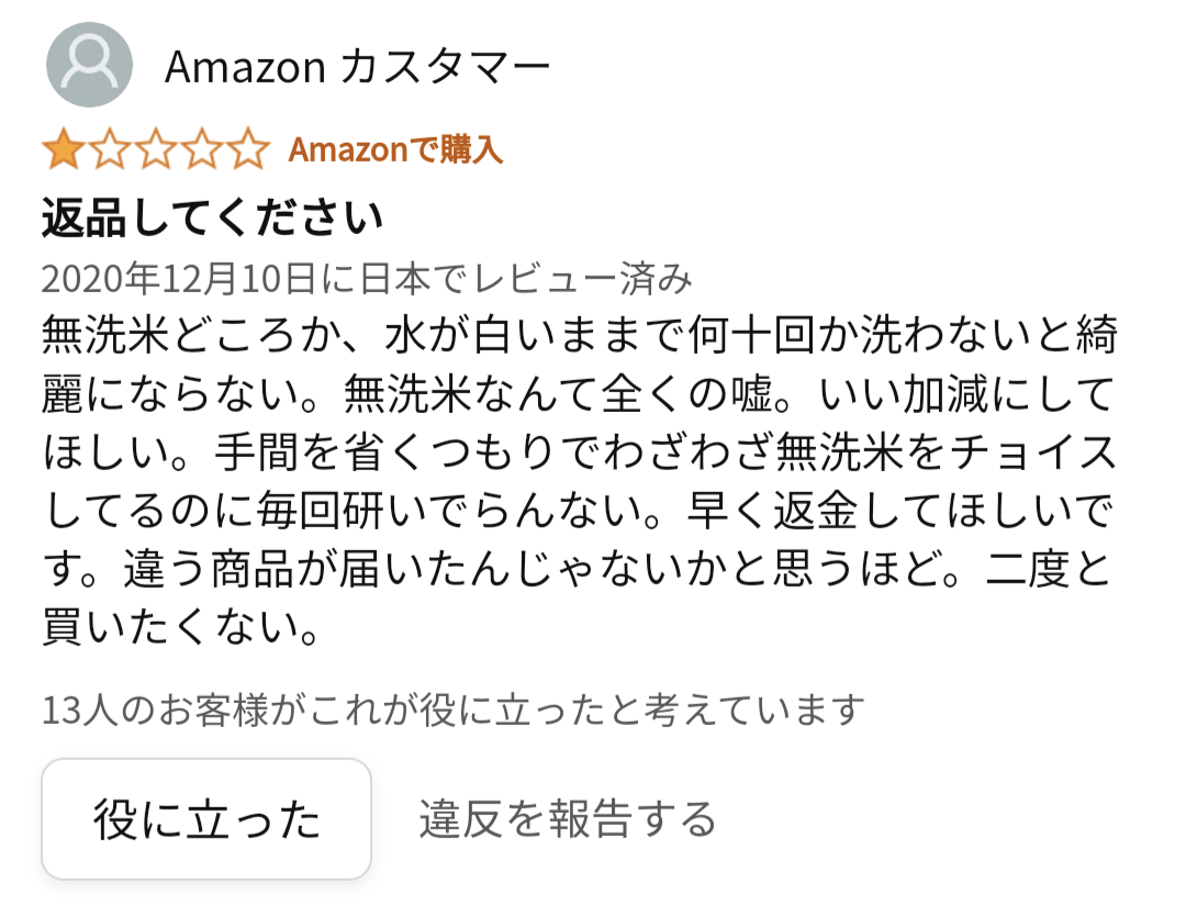 Amazonレビュー「無洗米を何十回洗っても水がキレイにならない。金返せ」