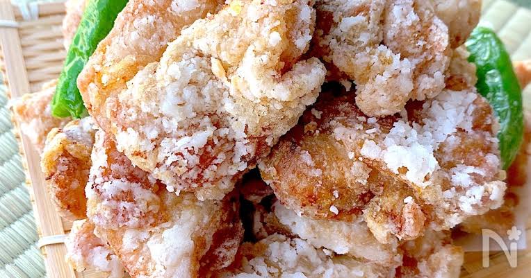 耳かき1杯の重曹も入れてモモ肉に下味、衣は片栗粉だけか片栗粉に米粉かもち粉少し。