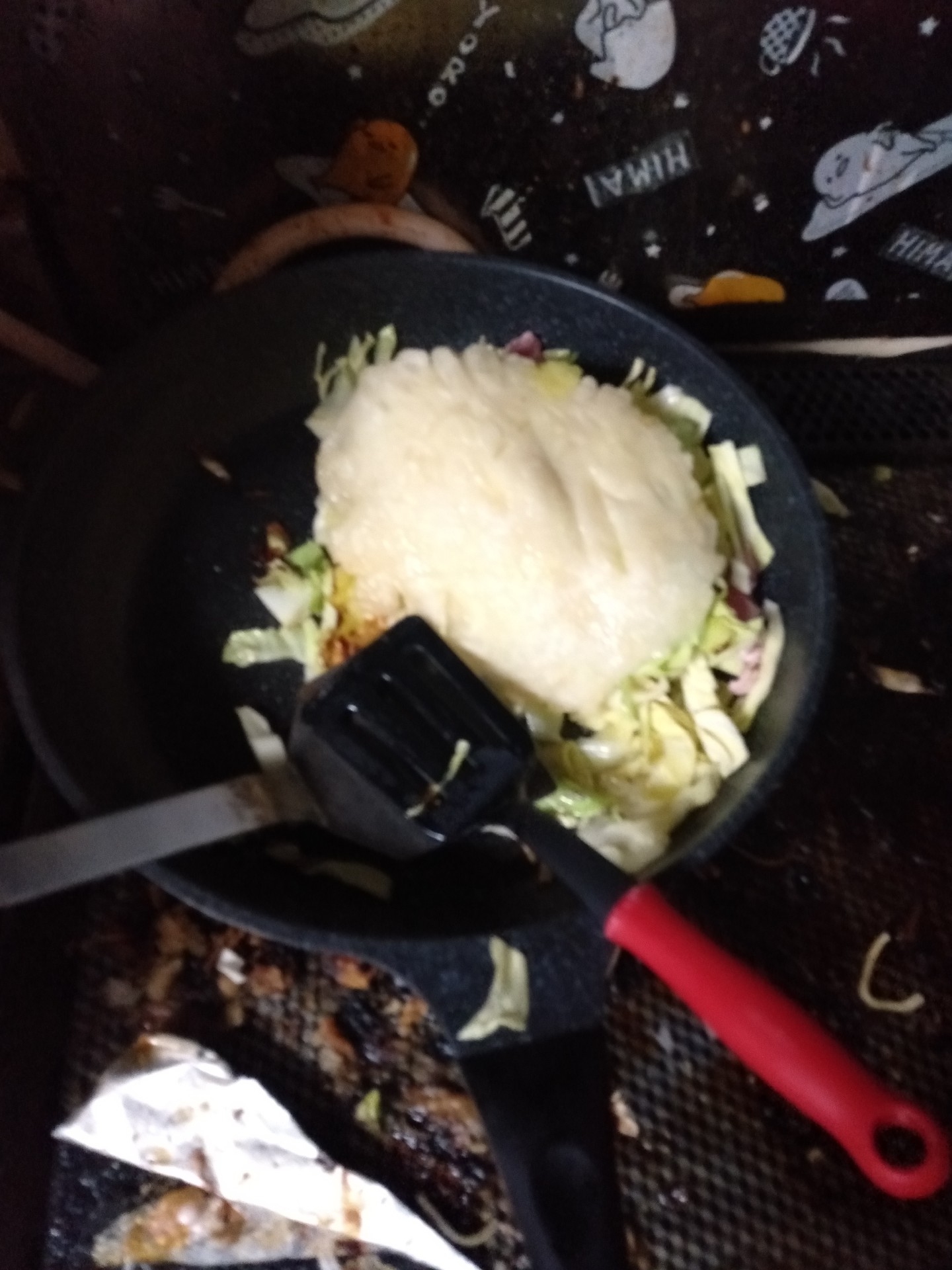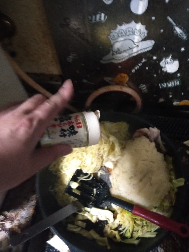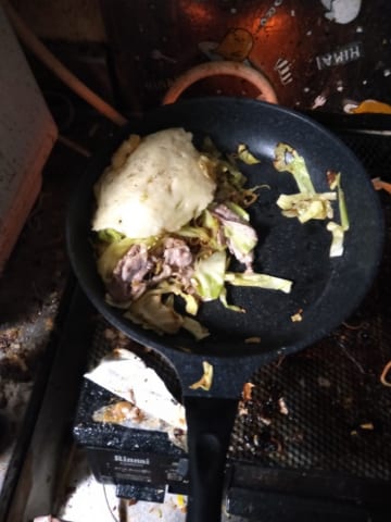 お土産で広島風お好み焼きセットもらって作ったけど、フライパン2枚使いした。