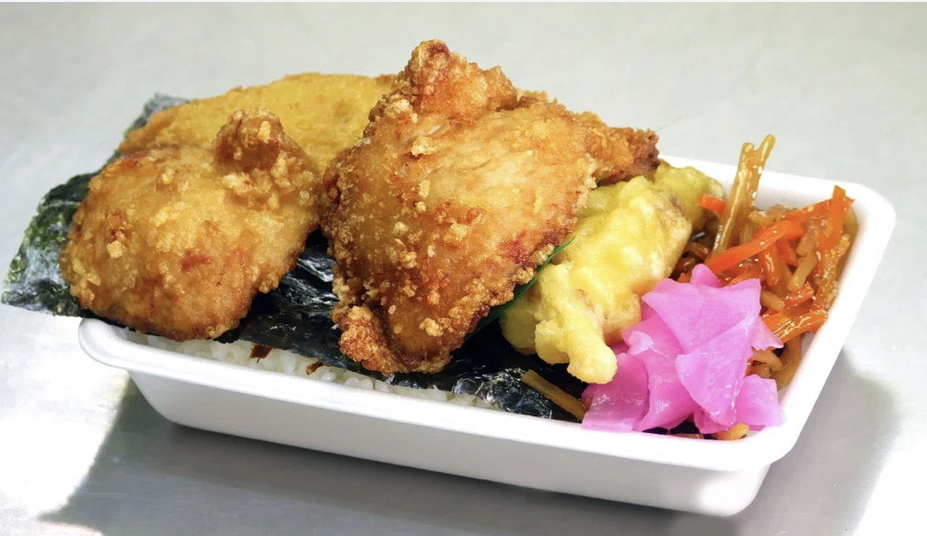 日本亭のまつだくん弁当好き。裏メニューで唐揚げの半分が衣に豆板醤を混ぜた辛いやつになってる。