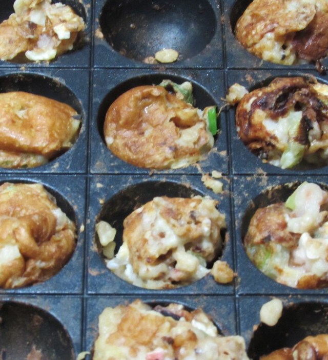 具を入れたらタコ焼き鉄板ギリギリまで生地を流し込む。
