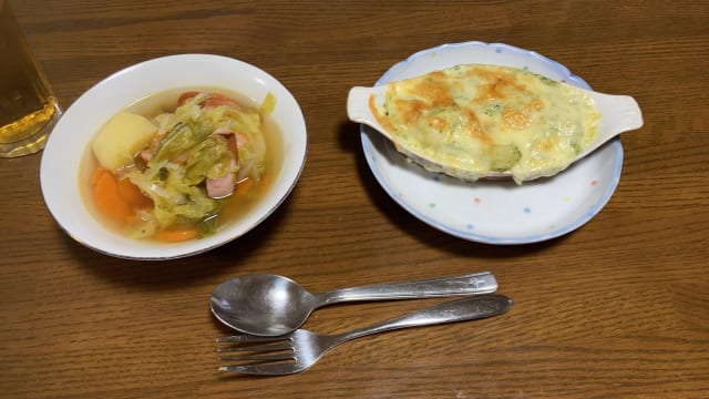 コンソメスープに具が入ってたら、ブイヨンに具材を入れて似た「ポトフ」。