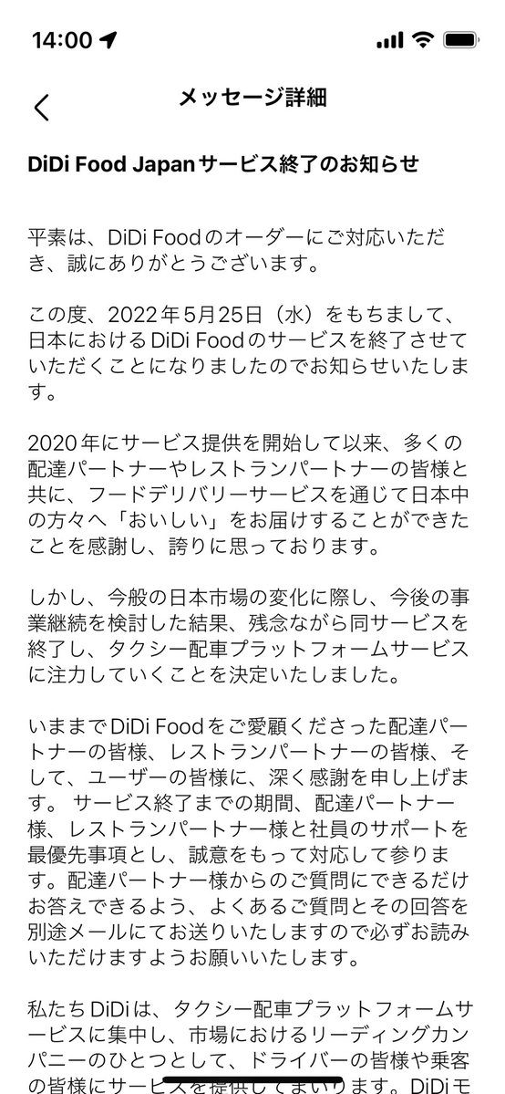 この間DIDI開いたら配達してくれるとこなくてクーポンもすっかり無いから注文避けてたけど撤退するからか