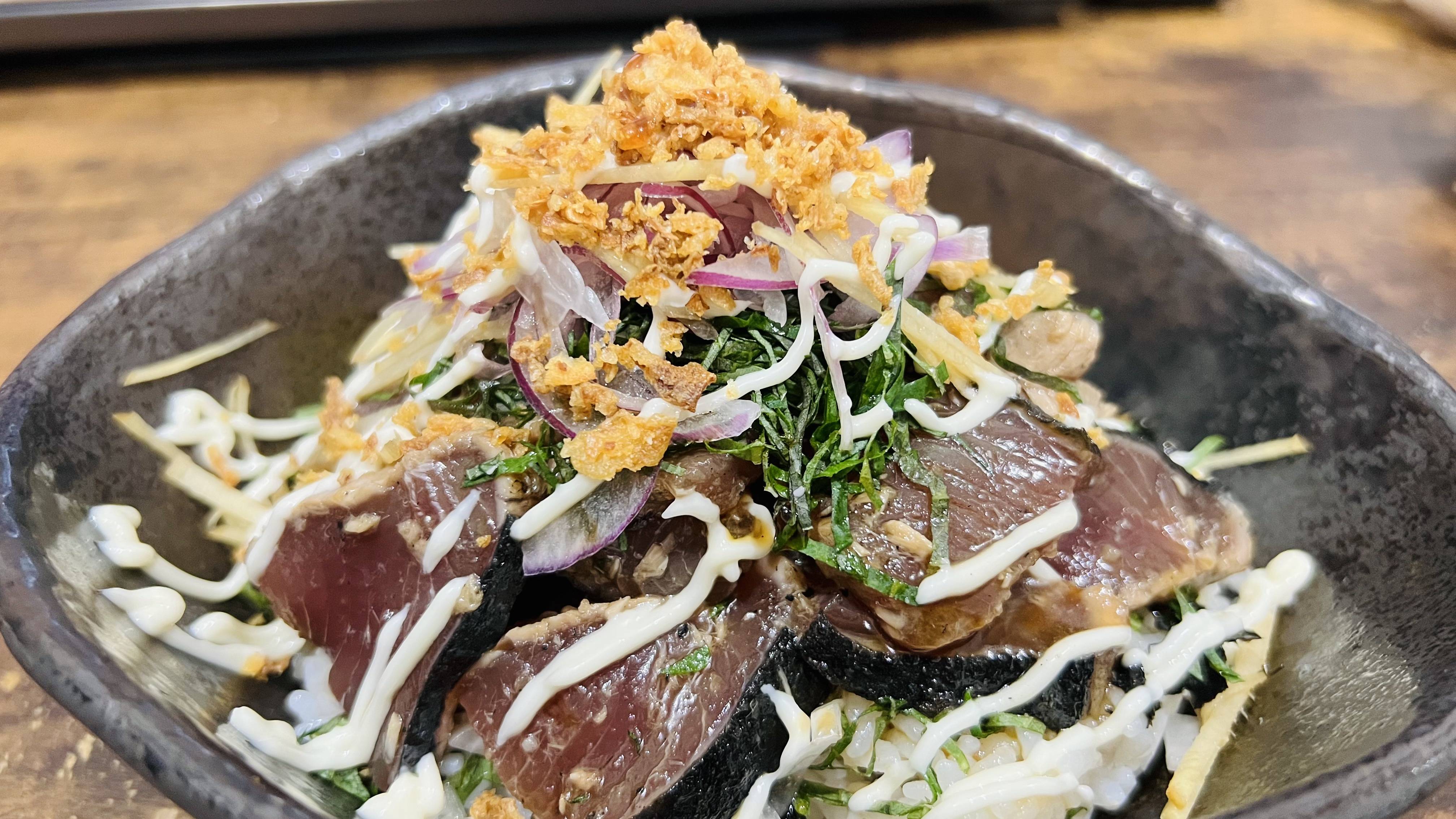 ニンニクの薄切りと玉ねぎ、紫蘇たっぷりにポン酢かけて食べるのには敵わないけど、戻り鰹にマヨはめっちゃうまい