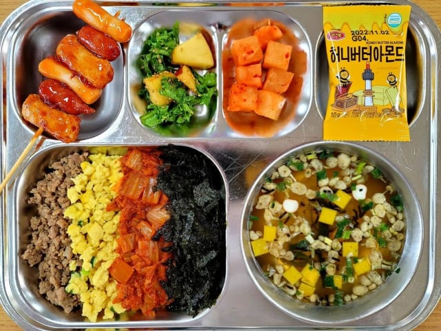 「最近の韓国の小学校給食。栄養士が毎日のように父母に公開する献立写真だ。 韓国の場合、小·中·高校は義務教育なので学費と給食費ともに無料だ。私の小学校の頃に比べると給食のクオリティが良くなったようだ。やはり国力が成長したという事実が実感できる」 pic.twitter.com/PF0Fy2qkQH