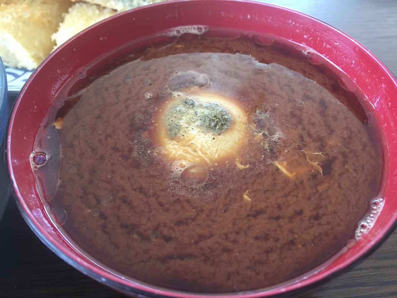 赤だしのお味噌汁に半熟卵が浮いてるやつやわ
