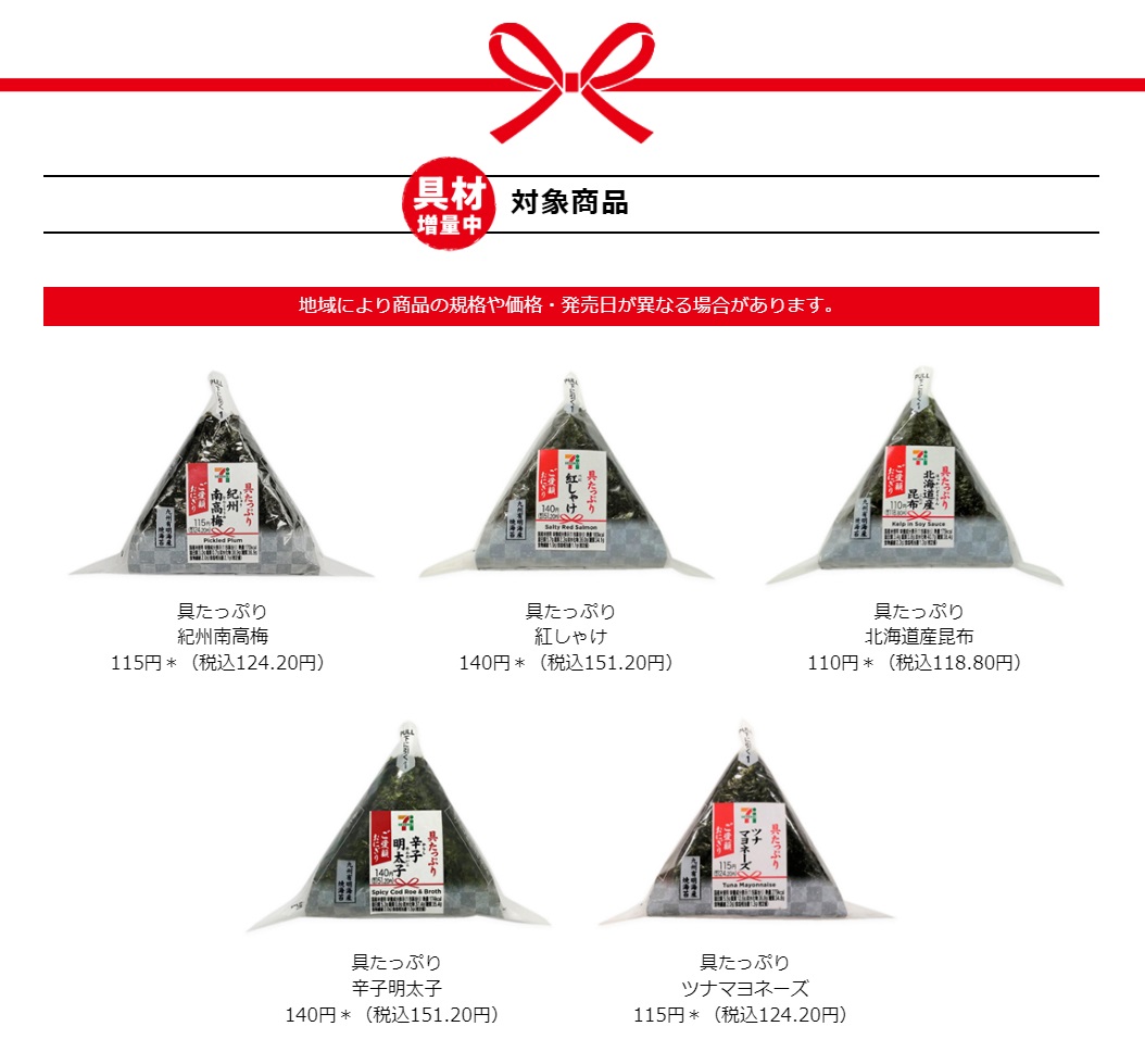 セブンイレブンの「おにぎり」具材増量中! GW期間中限定、定番人気が具たっぷりにセブン-イレブンでは4月29日から5月8日のGWの期間、「ご愛顧おにぎり具材増量」と題して人気のおにぎりの具材を増量するキャンペーンを実施しています。 「紀州南高梅」(124.2円)、「紅しゃけ」(151.2円)、「北海道昆布」(118.8円)、「辛子明太子」(151.2円)、「ツナマヨネーズ」(124.2円)の5品を今だけ「具たっぷり」商品として販売中。日頃の感謝を込めたキャンペーン。 https://ascii.jp/elem/000/004/090/4090701/#eid3357252
