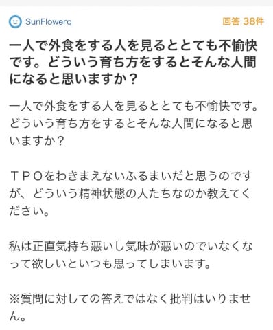 一人飯が抵抗があるのはいいが、他人がそれやっててイラつくってのは控えめに言っても病気だろ
