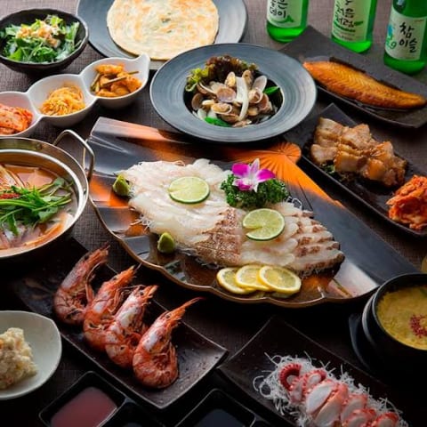 分かってると思うけど、ナムルなんてそれっぽい名前を付けてるけど、お総菜は和食と同じものにごま油か辛子を足したもの。写真の海産物はほぼ和食のコピー。あと、しれっと餃子並べて写真撮ってるのは笑えるな。