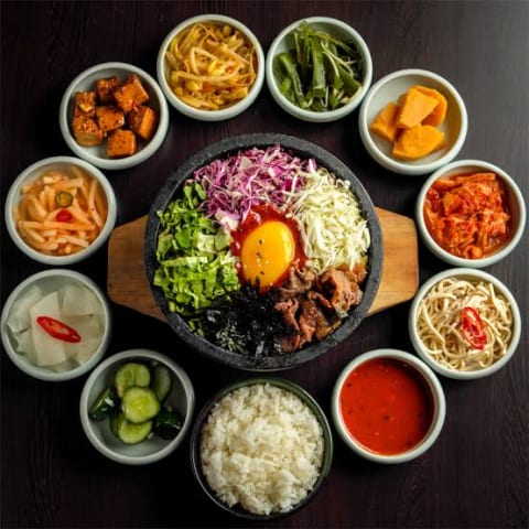 メイン+キムチ+ナムル+キムチ+ナムル+キムチ+ナムルのイメージ。
