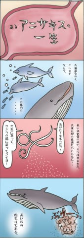そして、その魚を、クジラが餌として捕食。アニサキスはクジラの体内で卵を産み、クジラから排出された卵を、また魚が食べるという連鎖が起きています。