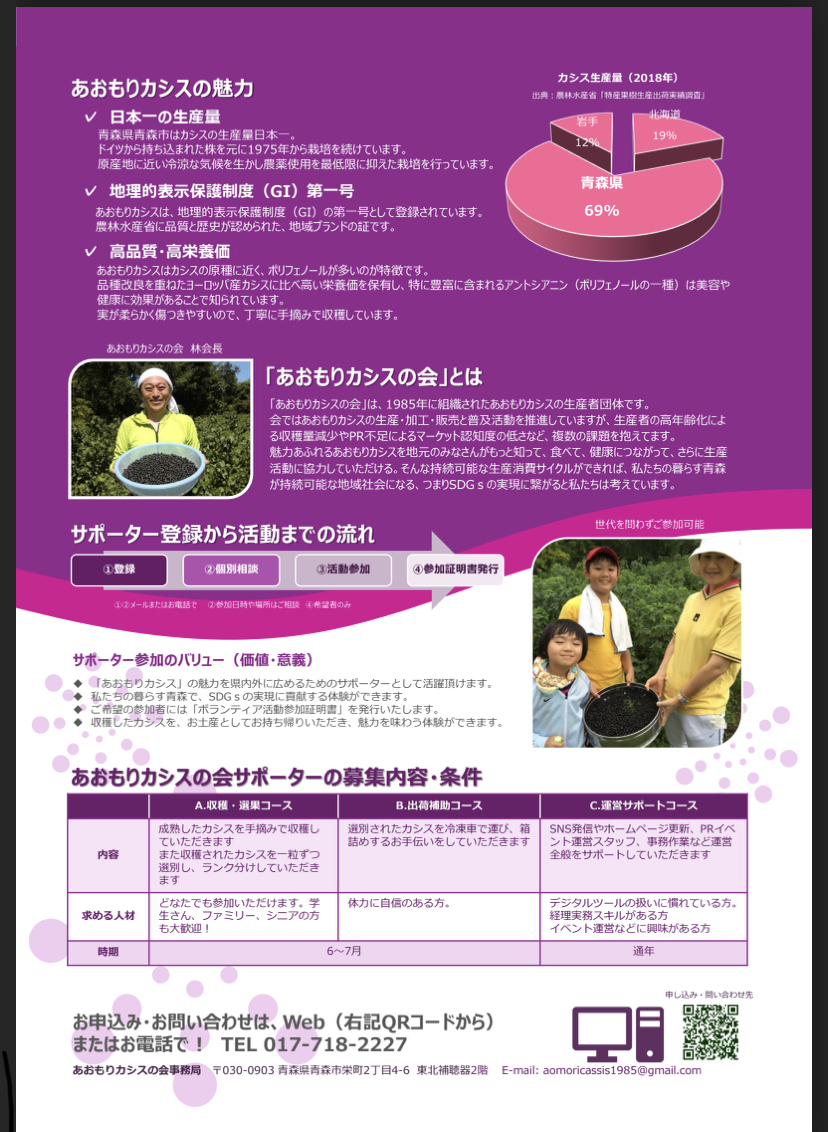 「各地から注文が殺到しているが、売るものがなく、断っている。今年収穫するものについても『(あらかじめ)確保したい』との要望が来ているが、それも約束できない。本当につらい」と林会長は話す。  このため同会は、ボランティアの力を借りて生産量を維持していくことを考え、サポーター制度をつくった。 園地で実際に摘み取り、選別する「収穫・選果コース」と、選別したカシスを冷凍車で運び箱詰めする「出荷補助コース」、「運営サポートコース」(通年)の三つを用意。 このうち収穫・選果コースは、応募者の住所になるべく近い生産者の園地に出向いてもらい、収穫作業をしてもらう予定だ。  「少なくとも1日3時間手伝ってもらえれば、ある程度の量は収穫できる。ぜひ応募を」と林会長。猪股弘行副会長(70)は「新規にカシスを栽培したい人も連絡してほしい」と呼びかけている。 https://news.yahoo.co.jp/articles/fd68db2d37bf132fa86a0f8c20b70d73499b737b