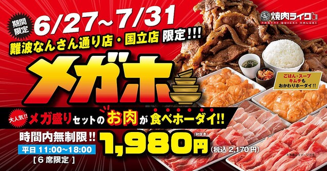 平日の午前11時から午後6時までの間、人気メニュー「メガ盛りセット」のバラカルビ、豚カルビ、牛ホルモンのほか、ごはん、キムチ、スープが時間無制限で食べ放題となる。価格は税込み2170円。7月末まで実施している。
