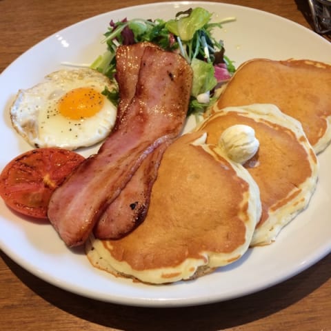 画像の目玉焼きandベーコンのメープルシロップ掛けパンケーキ食べてみたい。