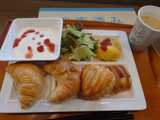 クロワッサン、パンオショコラ、スクランブルエッグ、ウインナー、ヨーグルト、コーヒー