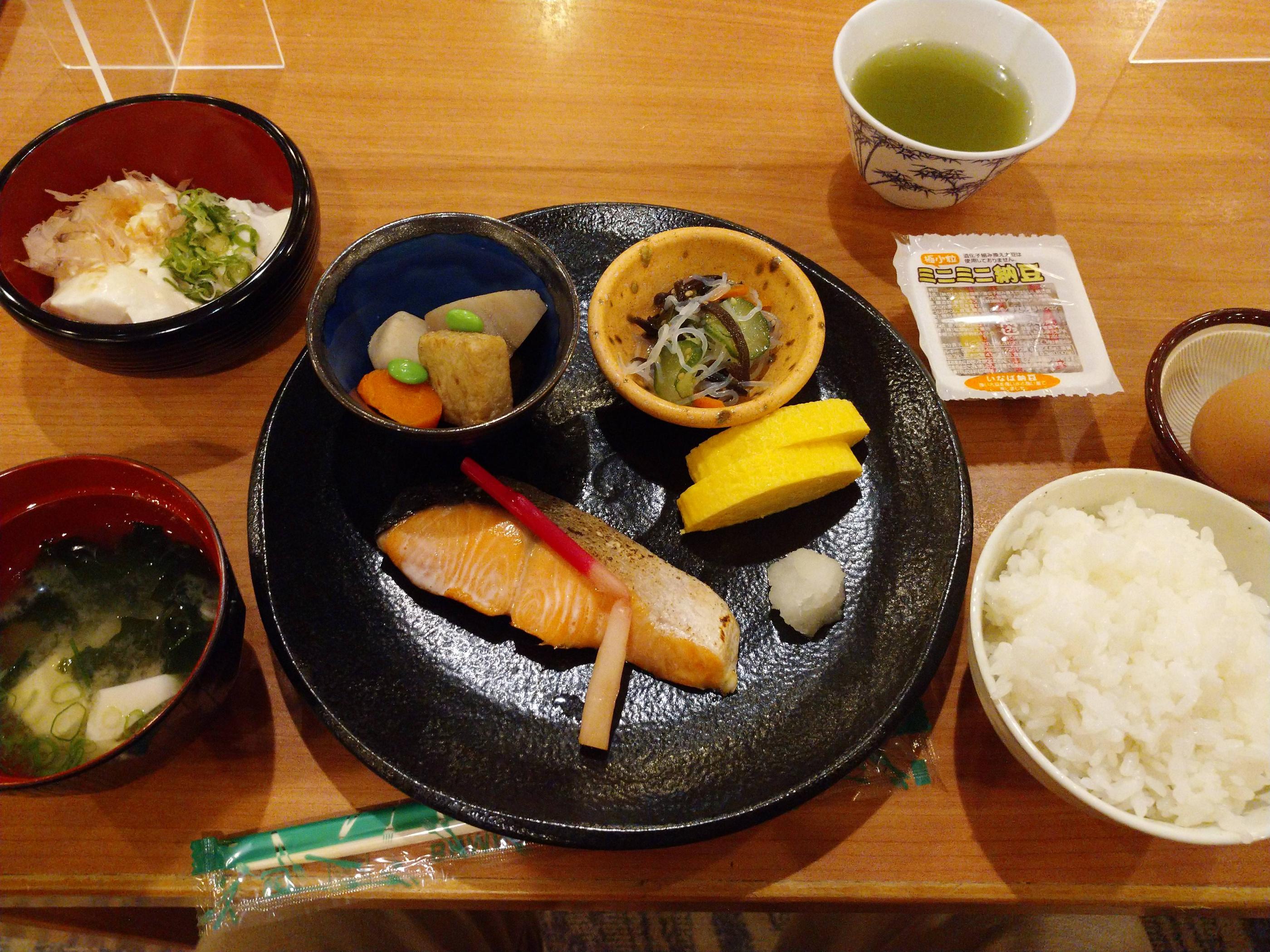 ご飯、豚汁、焼き魚、納豆、目玉焼き半熟、豆乳