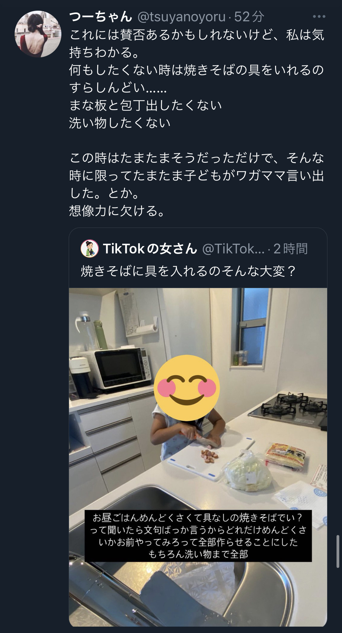 成長期の子供にとって具無し焼きそばが栄養的にバランスが良いわけないし、こんな経緯で親に料理をさせられたら、娘は家事を罰ゲームのように感じてもおかしくないよなあ