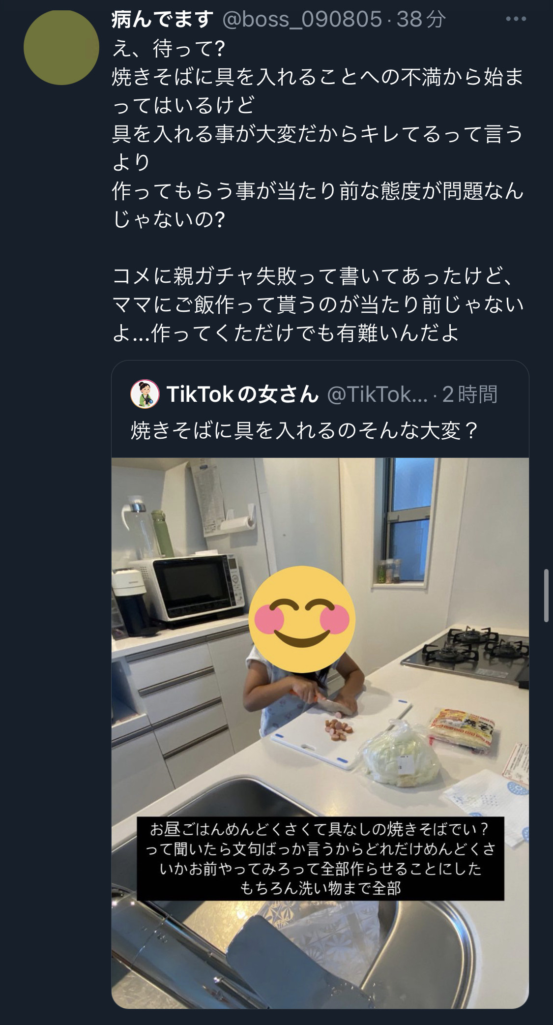 面倒だから具なしの焼きそばを提案しておいて、拒否されたら切れ散らかして子供にぶん投げてそれをSNSにアップして晒すのは面倒じゃないんだ