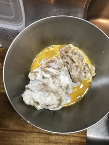 片栗粉が剥がれないようにやさしーく卵でコーティングするんや
