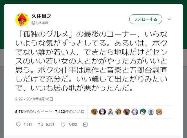 キムタクから誘われてるのに孤独のグルメのせいで断ったことが何回もあるって愚痴ってたな