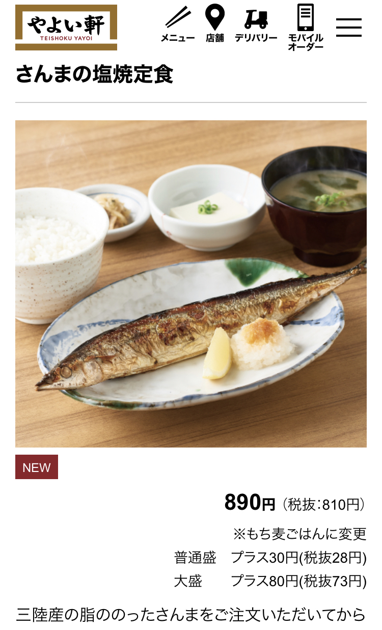 2021年の大戸屋「生さんま炭火焼定食」は980円(税込)。やよい軒の方が安いね