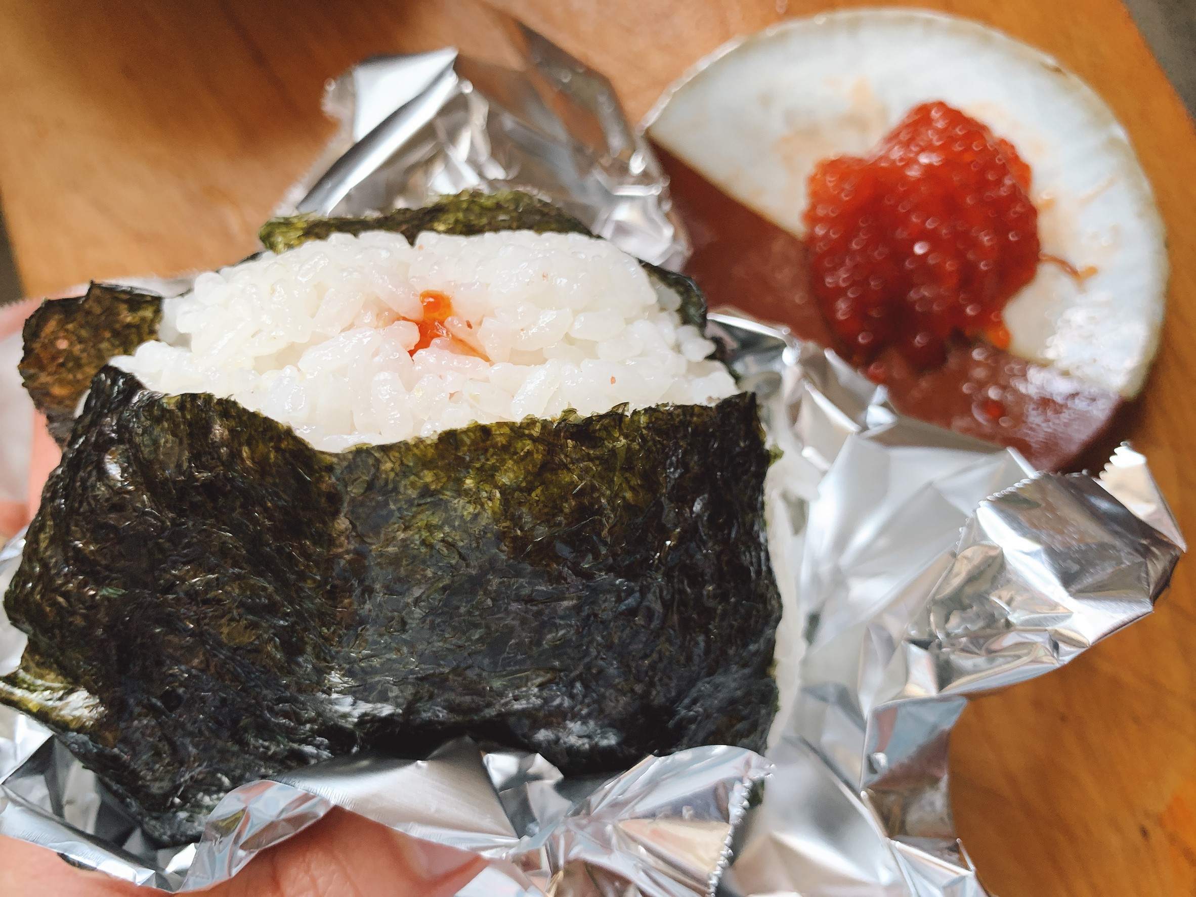 アルミホイルで包むと海苔の香りが海苔に残ったままになるけど、サランラップで包むと海苔の香りが米の中に吸収されて薄くなる。