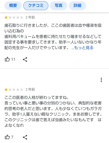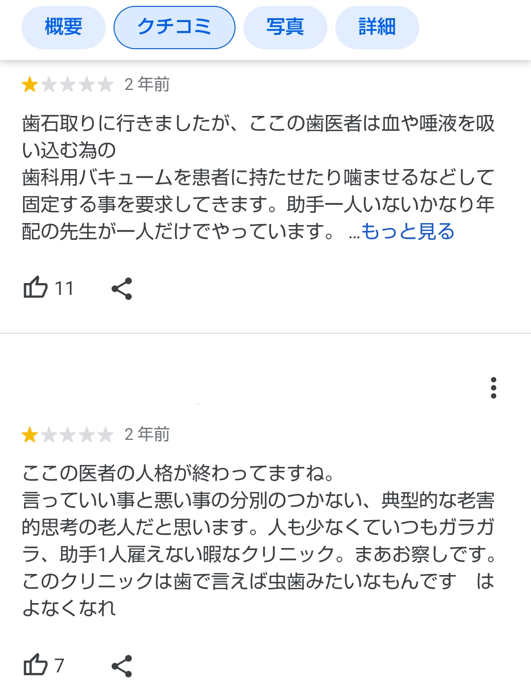 Googleレビューが星5とかいれててもそいつがその歯医者1件しかいれてなかったりする桜あるから逆に治療変にしないか悪いコメントをチェックしてるわ