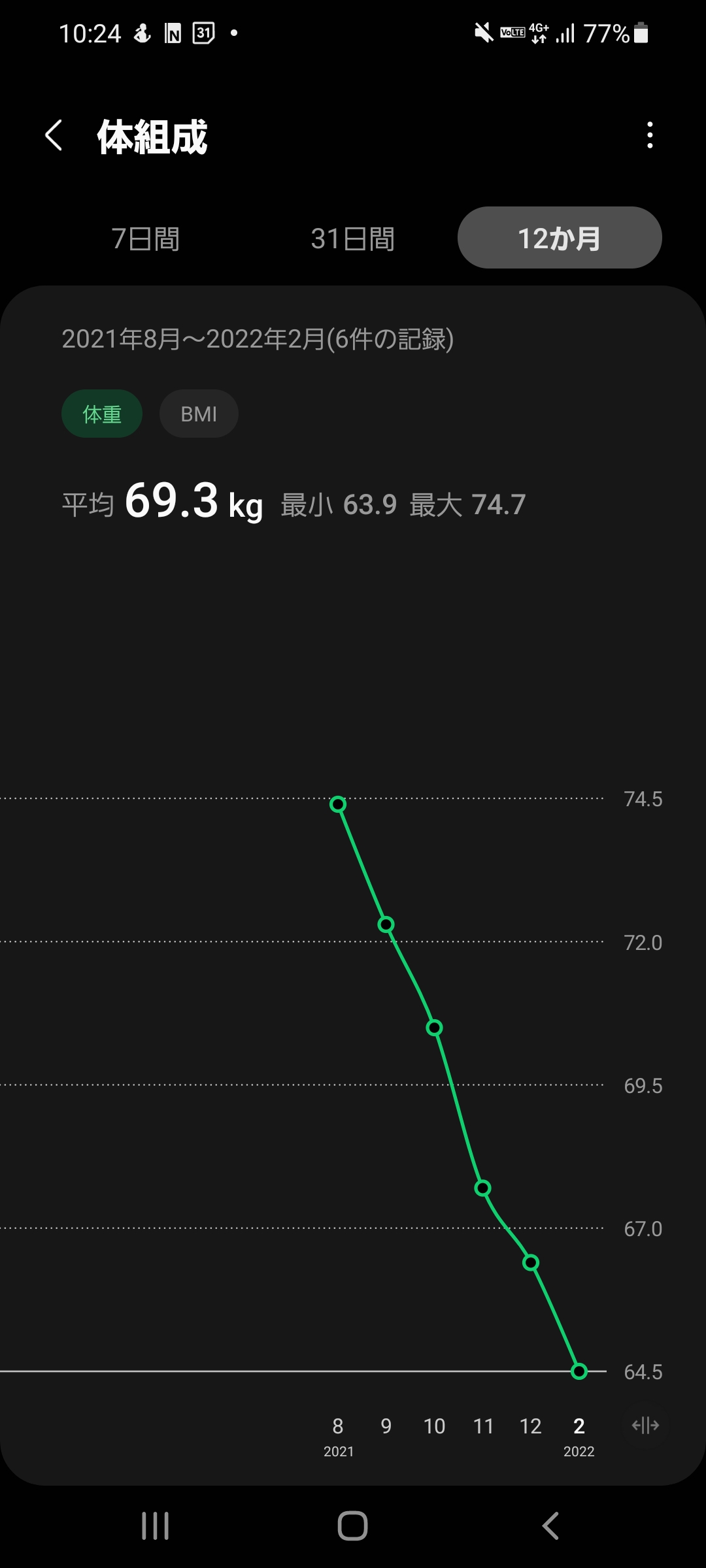 酒飲む仕事やめて2ヶ月目だけど71→64まで落ちたわ。