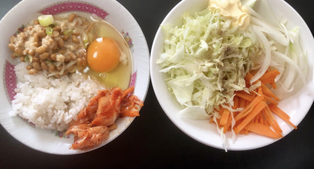 納豆があるのは別にええと思うけどなんでご飯にかけた汚い状態で写真を撮るんや