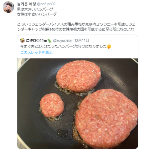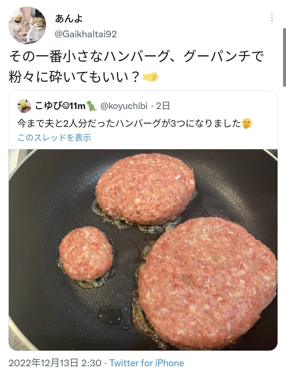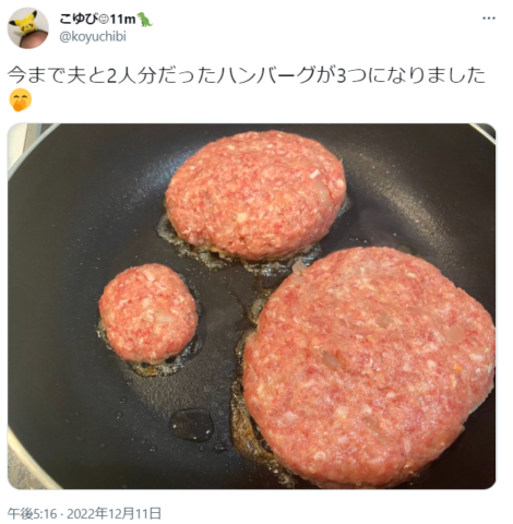 【闇深】女子「今まで夫と2人分だったハンバーグが3つになりました♪」→炎上