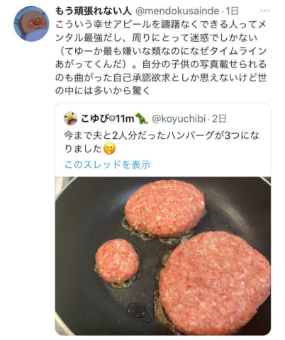 赤ちゃんがミルクから離乳食、ハンバーグが食べれるぐらいまで育ったって微笑ましい事なのに他人の幸せを妬む性根がそんなんだからまんさん幸せ掴めないんだぞ