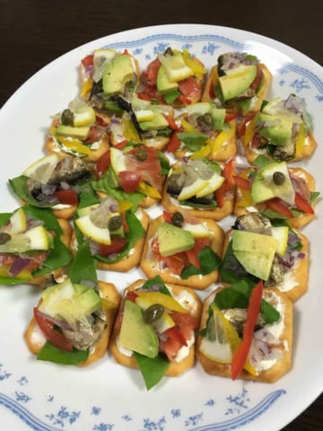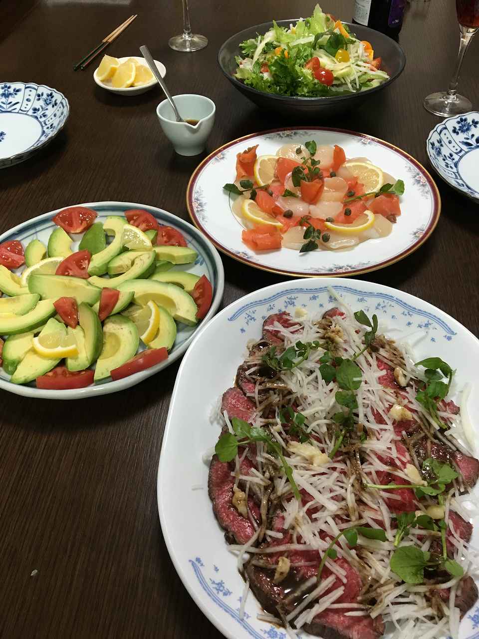 前菜にブルスケッタ。12月が旬の洋梨を「生ハム巻」で。サーモンとオレンジのサラダ。