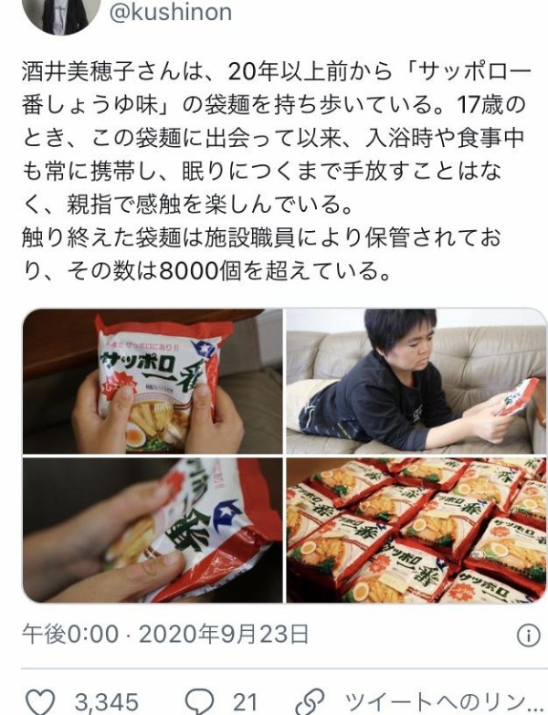 【悲報】女性「20年以上毎日21時間、入浴時や食事中も袋麺を持ち歩いて触ってる」