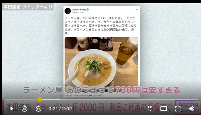 まてまて、本田はラーメンの値段をもうちょっと上げるべきって言ってるだけで値段を2000円にすべきとは言ってないぞ?