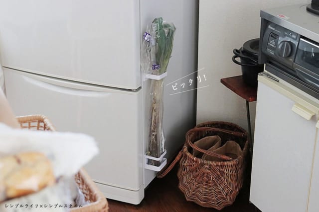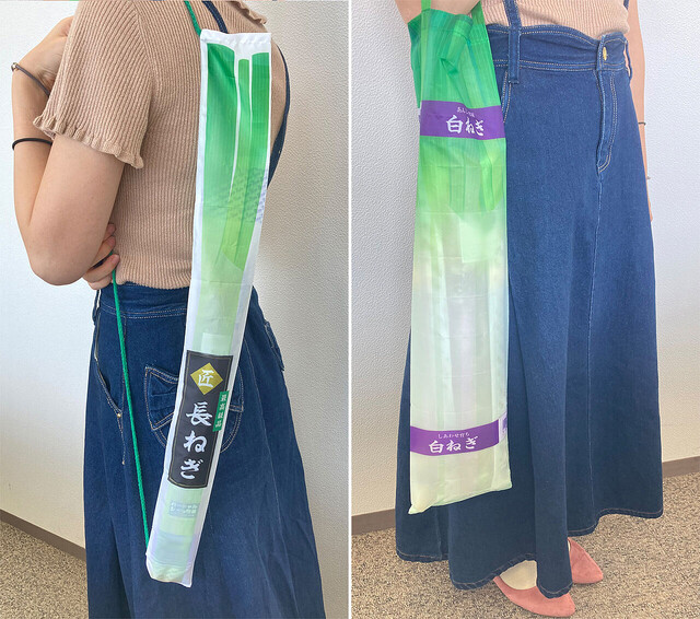 ネギを袋の中に立てて、袋の側面上についてる耳みたいな部分でネギを巻いて